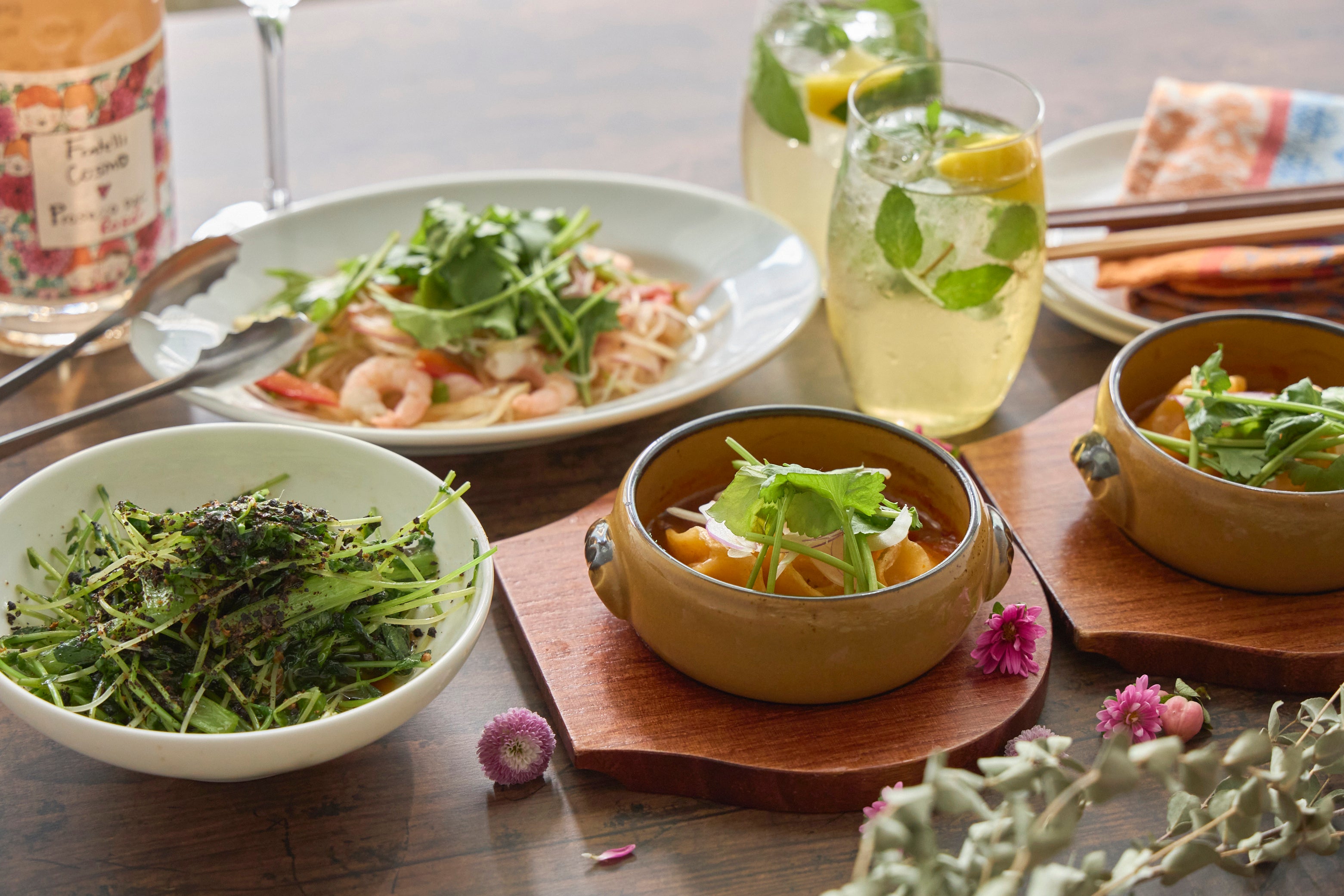 ■海老と春雨のエスニックサラダは、タイのヤムウンセンをイメージしました。たっぷりのパクチーとスパイスの香り、香ばしいピーナッツをアクセントに加えた、ワインとも相性の良いサラダです。