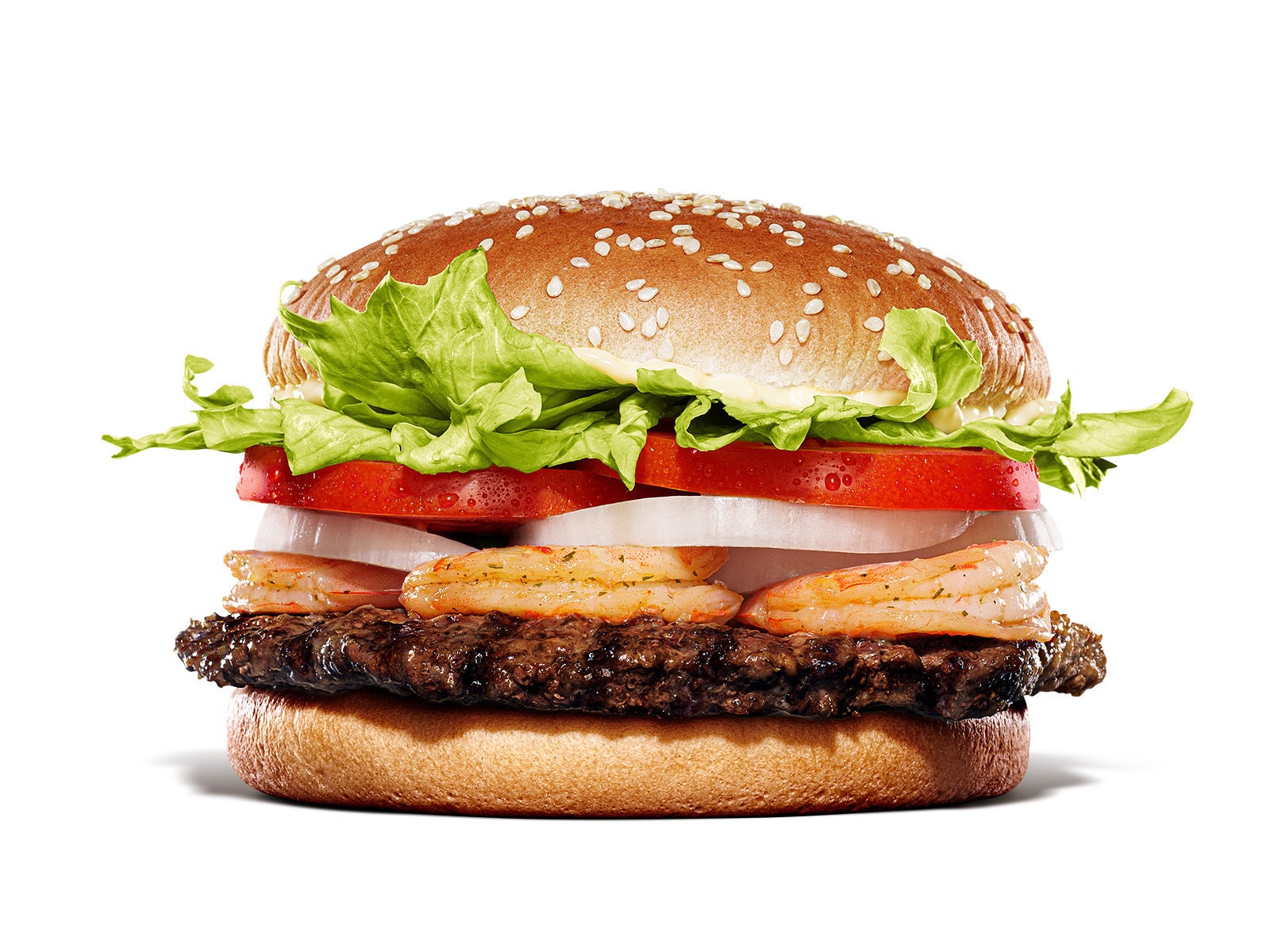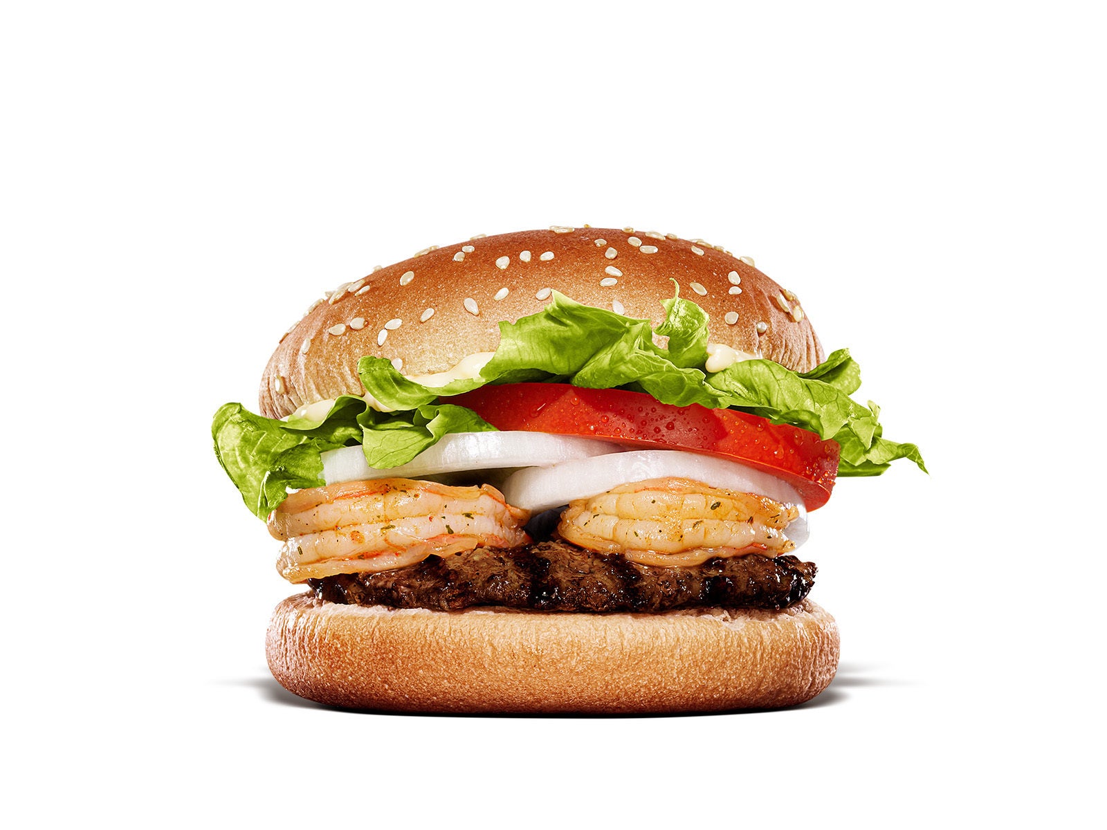 『ダブルシュリンプワッパー® 』は、バーガーキング® 自慢の直火焼きの100%ビーフパティ2枚に、ぷりぷりのエビにスパイスをきかせたガーリックシュリンプを重ね、フレッシュなレタス、トマト、オニオン、クリーミーなマヨネーズを合わせた、食べごたえ抜群のバーガーです。