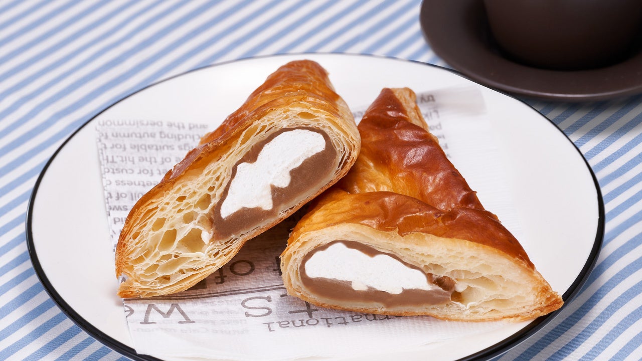 三角形のパイに、コクのあるまろやかなカフェラテ風味クリームとミルクホイップを包みました。朝食やティータイム、コーヒーとの相性も抜群です。