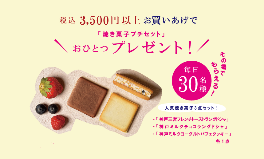 税込3,500円以上お買いあげのお客様へ、コンディトライ神戸の人気焼菓子をおあじみいただける「焼菓子プチセット」をプレゼント!毎日30名様のみの数量限定キャンペーンとなります。