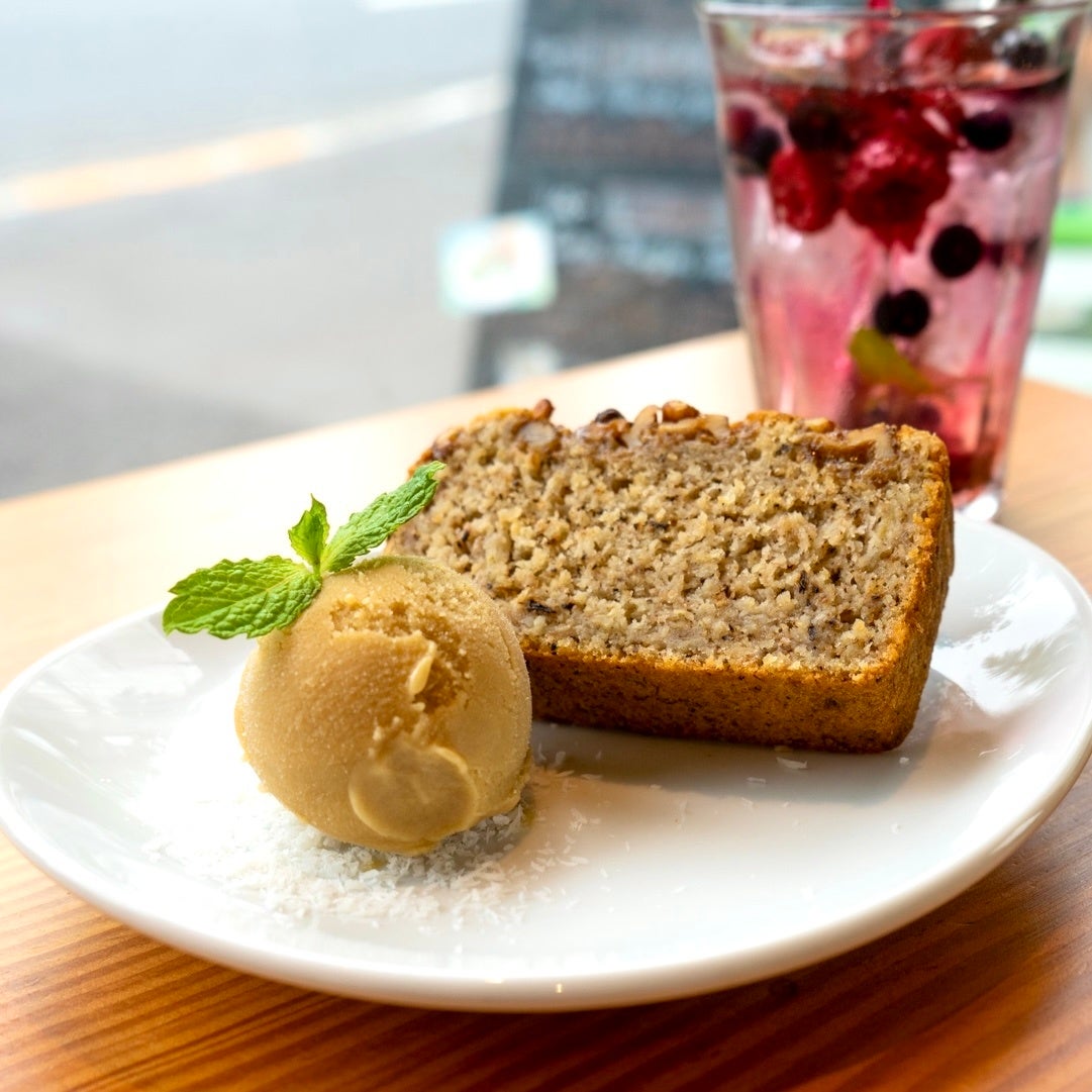 オートミールを使った、ビーガン&グルテンフリーのバナナパウンドケーキ。2日間限定で、自家製豆乳アイスを添えて提供します。
