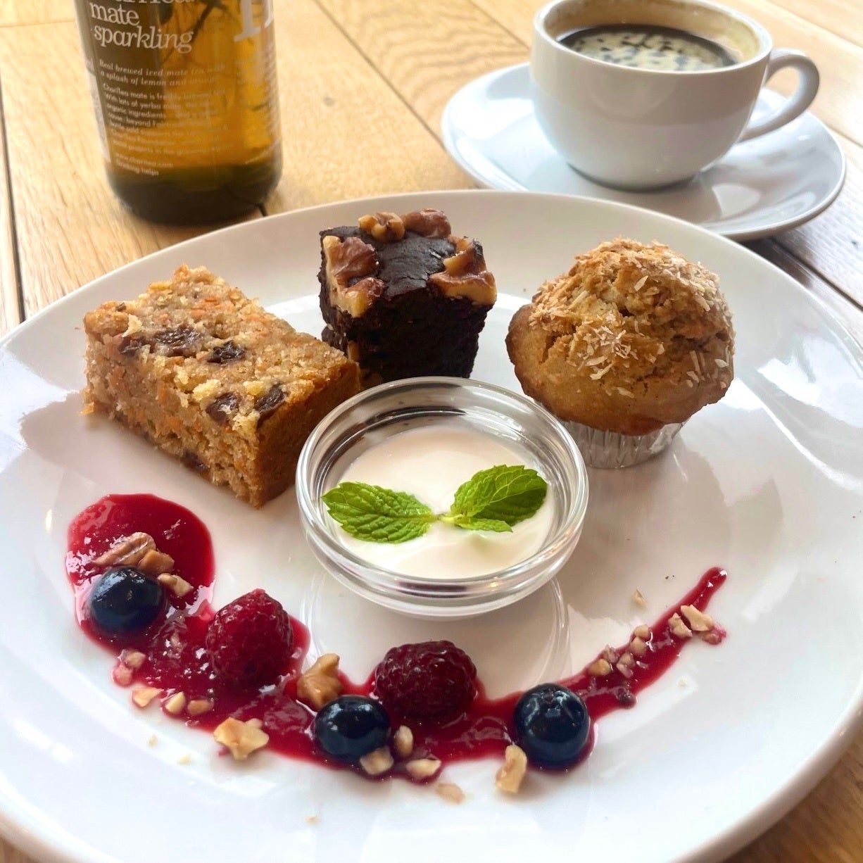 「ジャックさんのにんじんケーキ 」「ナチュラルブラウニー」「ココナッツキャロブマフィン 」のヴィーガンデザート3種類を堪能できる2日間限定のスペシャルなデザートプレート。