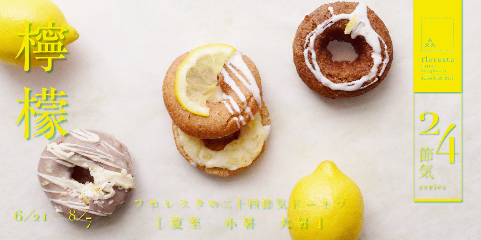 フロレスタ24節気シリーズ、今年の夏至のドーナツは、新作「レモンミルククリーム」が登場します。 地中海産レモンをたっぶりと混ぜ込んだクリームチーズをネイチャーにサンドし、仕上げにスライスレモンを大胆に載せました。 毎年大人気な爽やかドーナツ「檸檬-れもん-」と「レモンと紅茶」も合わせてお楽しみください。