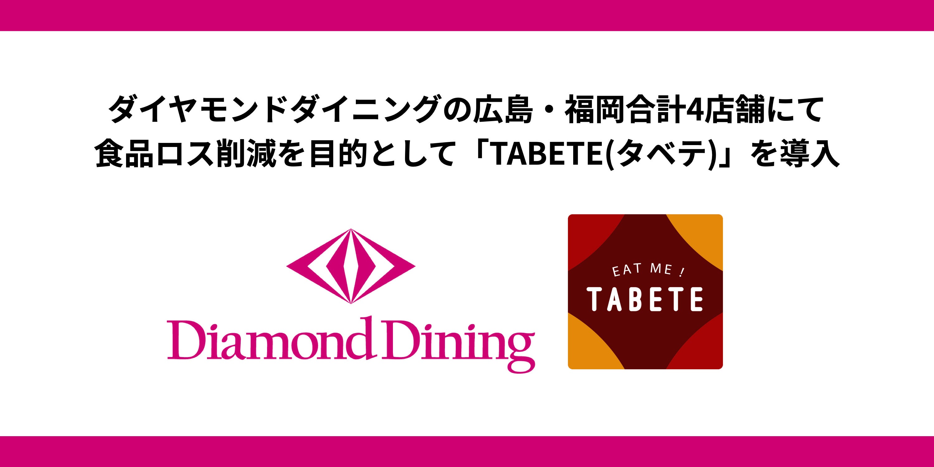 「TABETE(タベテ)」が、全国で300店舗以上の飲食店を展開する株式会社DDグループの連結子会社である、株式会社ダイヤモンドダイニング(本社:東京都港区、代表取締役社長:松村 厚久、以下ダイヤモンドダイニング)広島・福岡の4店舗にて、食品ロス削減対策として導入されることになりました。