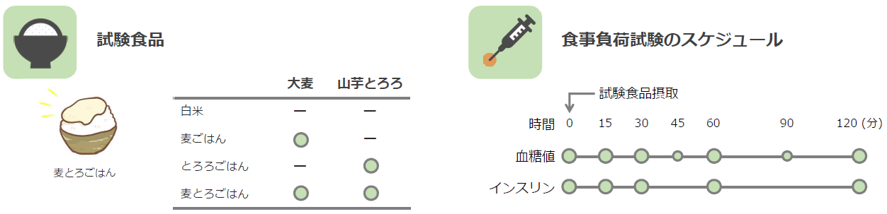 (2) 食事負荷試験:白米ごはんなどの食事を摂取した後の血糖値の変化を測定する試験。本研究では、白米、麦ごはん、とろろごはん、麦とろごはんを摂取した後の血糖値の変化を比較している。
