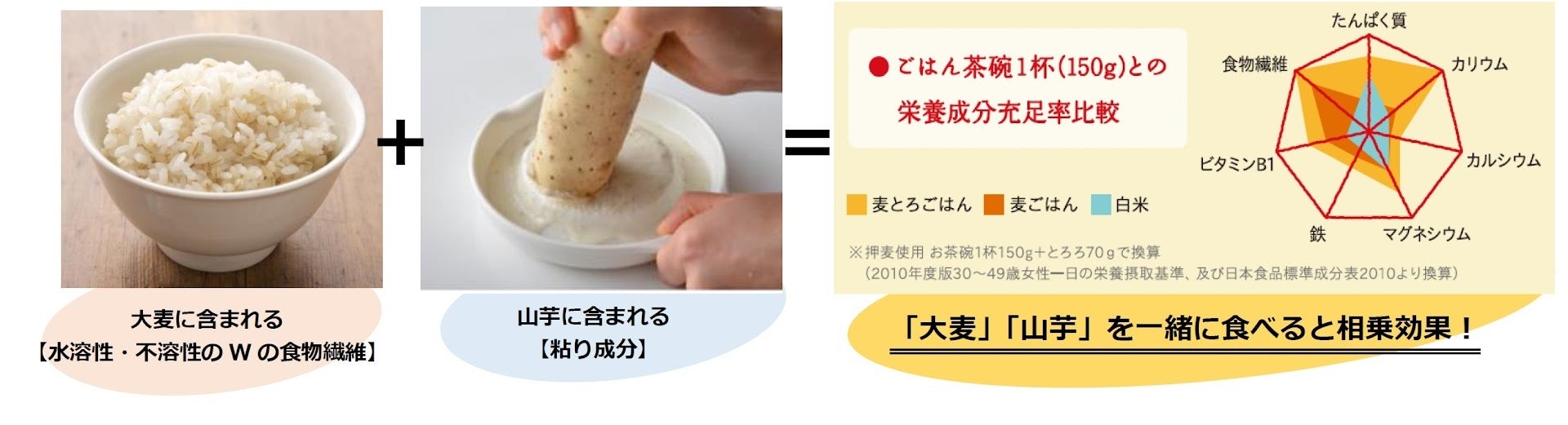 伝統的な麦ごはんの食べ方として麦ごはんにとろろをかけて食べる「麦とろごはん」があります。大麦にはβ-グルカン、とろろ(山芋とろろ)には粘性の高い水溶性の食物繊維が含まれており、食後の血糖値を低下させることが期待されています。
