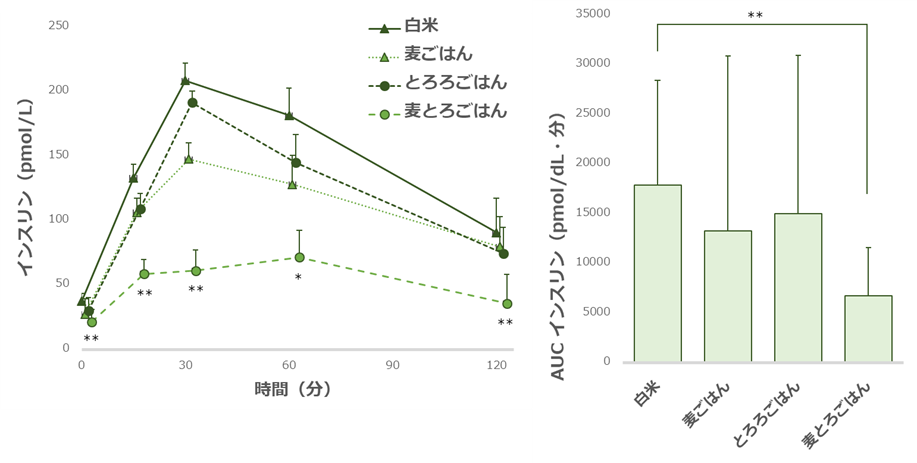 (*, **は白米と麦とろごはんでそれぞれp<0.05, p<0.01で有意に差が認められたことを示します)