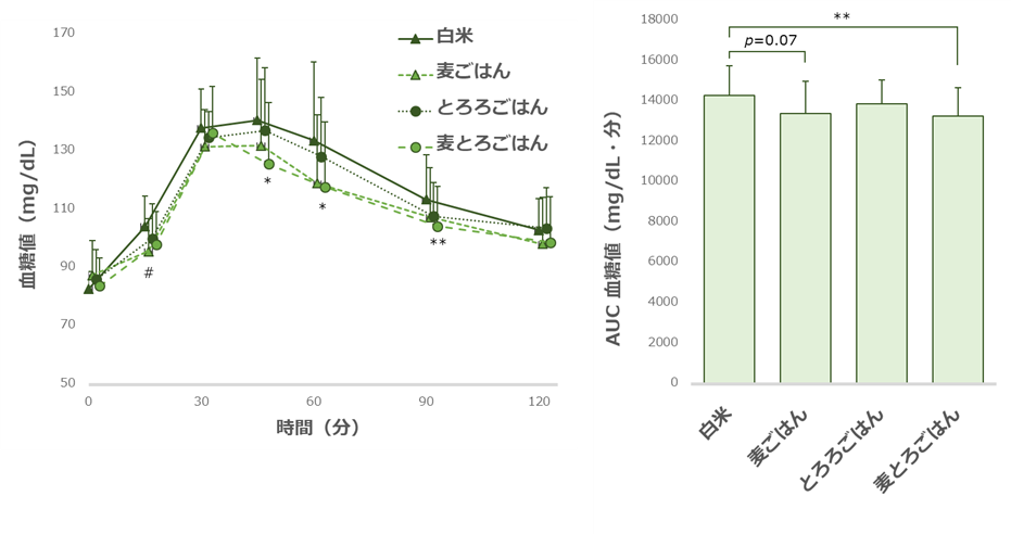 (#は白米と麦ごはんp<0.05で有意に差が認められたことを示し、*, **は白米と麦とろごはんでそれぞれp<0.05, p<0.01で有意に差が認められたことを示します)