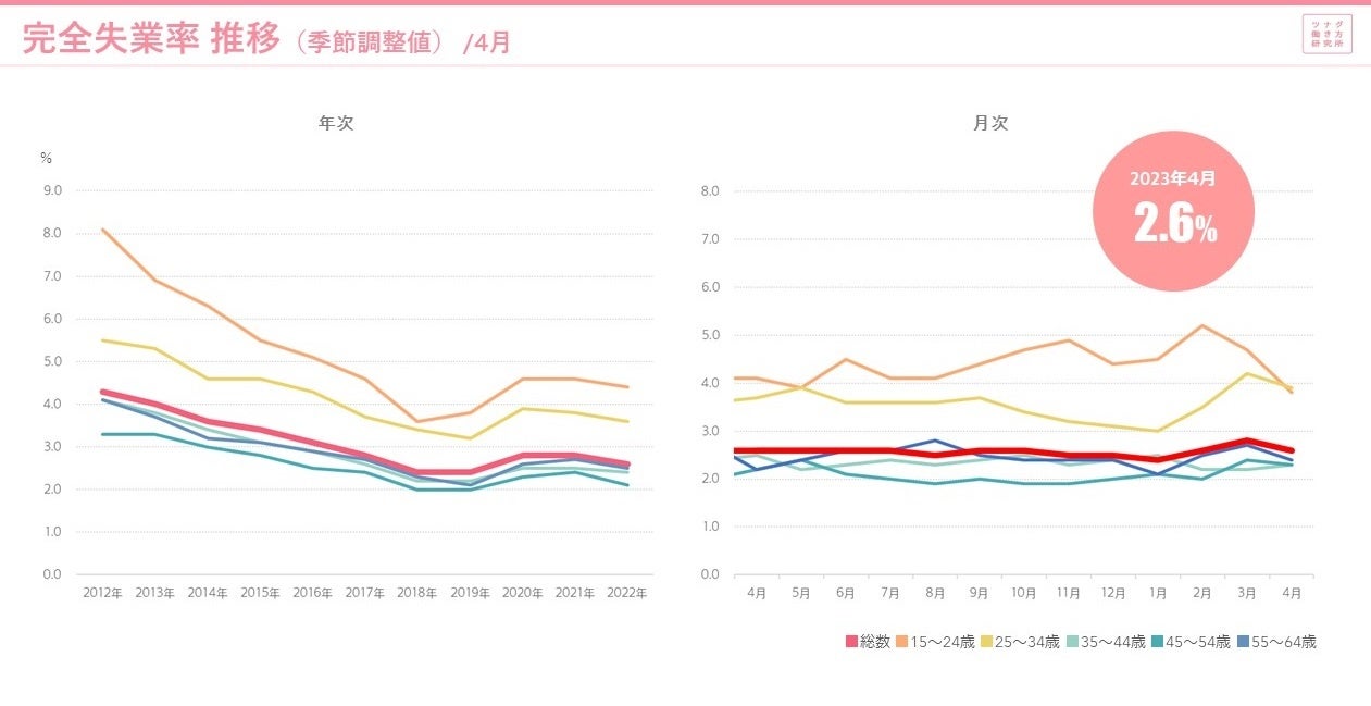 完全失業率(季節調整値)は2.6%で、前月比-0.2ポイント、前年同月と同水準となりました。年齢階級別では15-24歳(-0.3ポイント)と、35-44歳(-0.2ポイント)が、前年同月比で低下しました。完全失業者数は190万人で前月比で3万人減少しています。