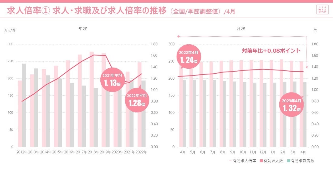 2023年4月度の有効求人倍率(季節調整値)は1.32倍。前月と同水準、前年同月比+0.08ポイントとなりました。パートのみの求人倍率(季節調整値)は1.32倍で全体同様前月と同水準、正社員の有効求人倍率(季節調整値)は1.03倍と前月(1.02倍)を上回りました。