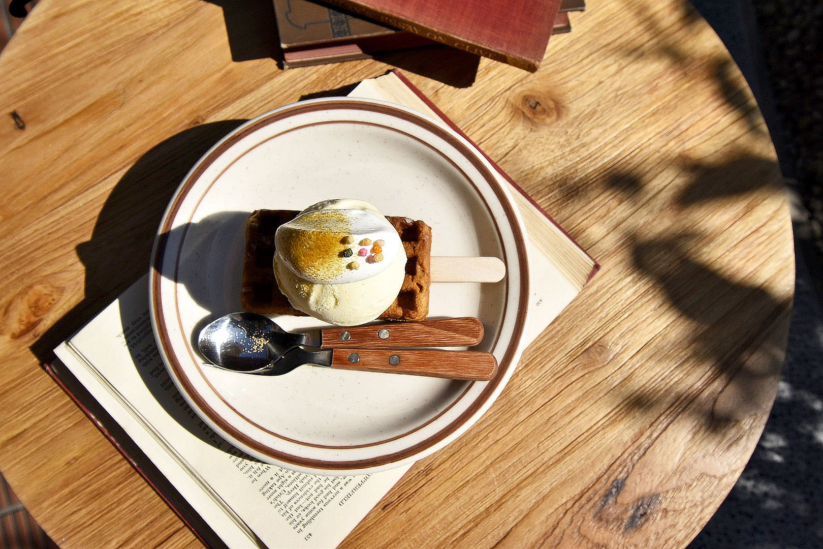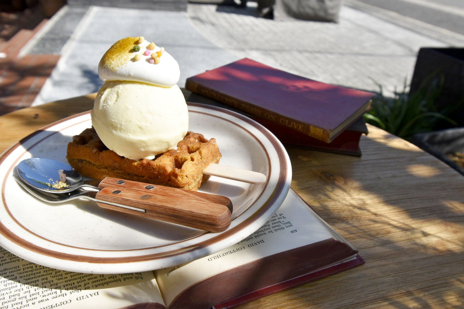 ビジュアルだけでなく、最後の一口まで楽しめるような食感にもこだわり、「京ワッフル」の生地には大きなザラメを練り込んでお作りしています。