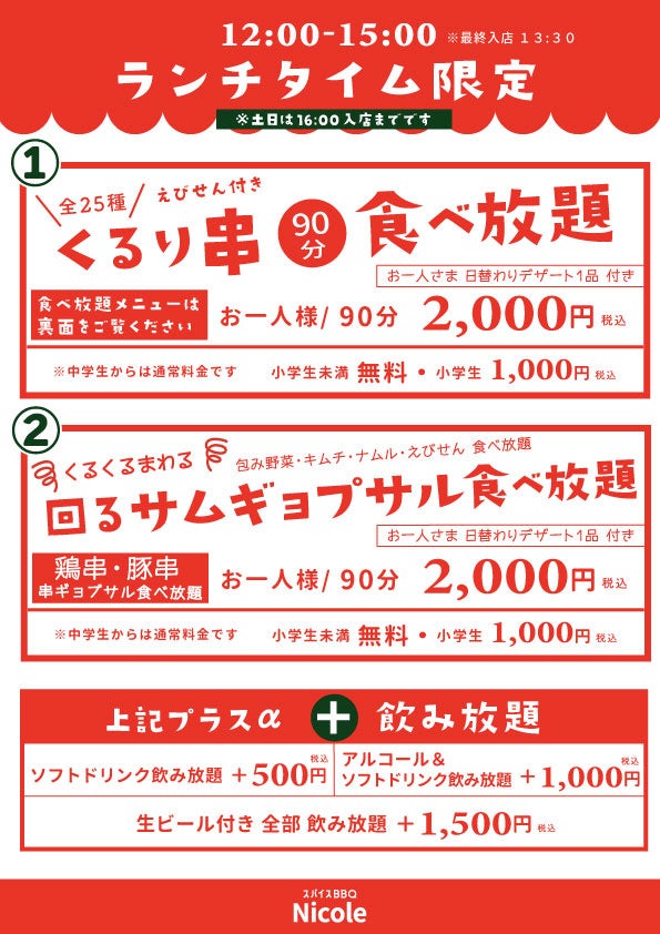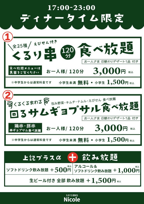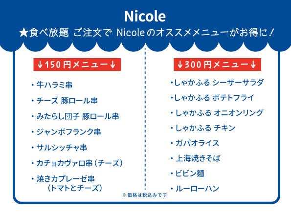 この度、6月12日(月)より以前よりご提供していた「くるり串食べ放題」と「回るサムギョプサル食べ放題」のプランをリニューアルいたしました。お求めやすい価格に見直し、さらにお得な飲み放題プランもご用意。また、食べ放題メニューをご注文いただいた方限定で、Nicoleのおすすめメニュー「しゃかふるポテトフライ」などがお得にお召し上がりいただけるなど、食べ放題プランが進化いたしました。
