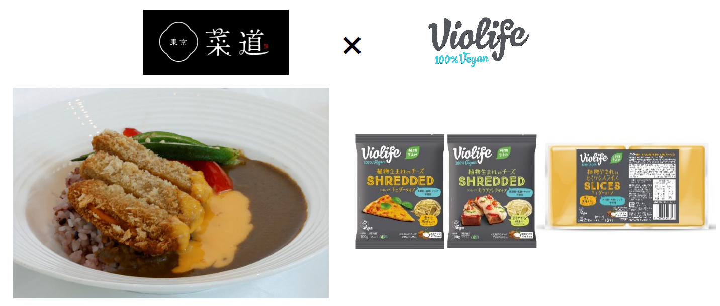 左から、ヴィーガンレストラン「菜道」で提供されるコラボメニュー「プラントベース チーズカツカレー」(コース料金*+660円(税込))、植物性チーズ「Violife 植物生まれのチーズ シュレッド チェダータイプ」、「Violife 植物生まれのチーズ シュレッド モッツァレラタイプ」(オープン価格)、「Violife 植物生まれのとろけるスライス チェダータイプ(業務用)」