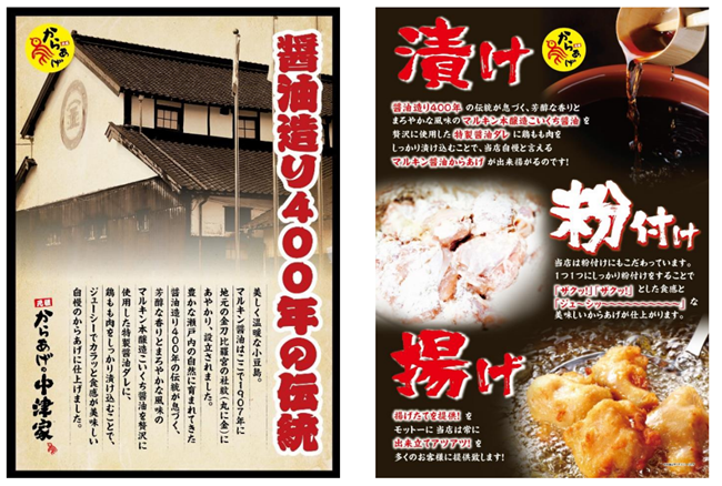 豊かな瀬戸内の自然に育まれてきた醤油づくり400年の伝統が息づく、芳醇な香りとまろやかな風味の「マルキン本醸造こいくち醤油」を贅沢に使用した特製醤油ダレに生姜・ニンニクをたっぷり混ぜ込み、鶏もも肉をしっかり漬け込む事でジューシーでカラッと食感が美味しい自慢のからあげに仕上げました。