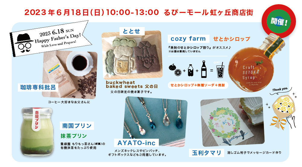 当日となる6/18は「父の日」。「いつもありがとう」の気持ちを込めたちょっとしたプレゼントもこゆ朝市で探せます!グルメなお父さんに、おしゃれなお父さんにもおすすめです。