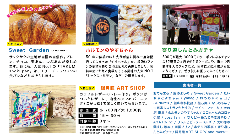 当日は初出店となる人気の飲食店をはじめ、新富町の地域おこし協力隊が運営するレザークラフトショップやガチャガチャコーナーも設置。子どもたちが帰ってきたくなる街づくりに向けてチャレンジの場を創出し続けていきます。