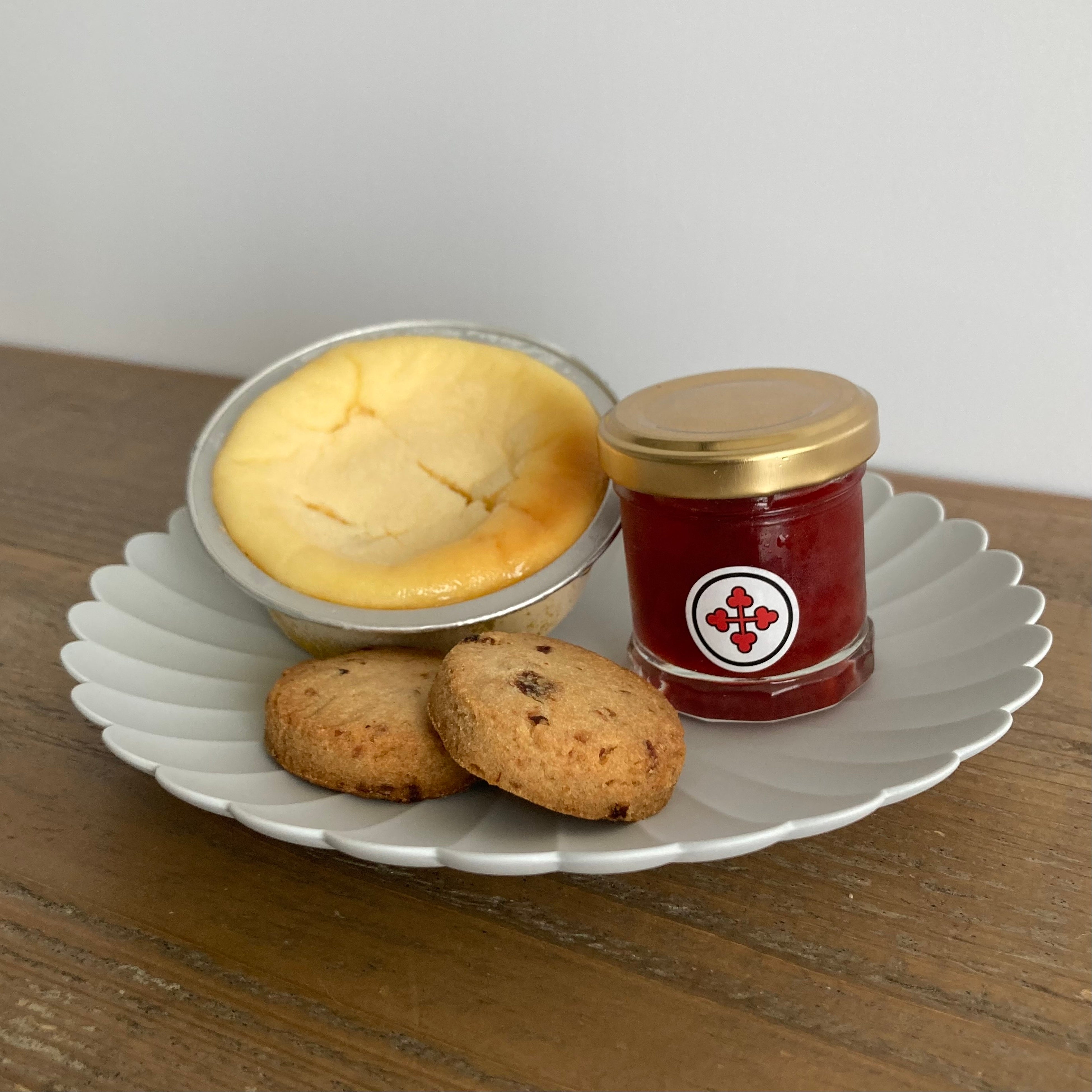 カオリーヌ菓子店の店主“かのうかおり”さんが、特別に作ったチーズケーキです。チーズケーキは宮崎・ダイワファームのブルーチーズを使用。大理石の模様のように、しっかりとカビの入ったブルーチーズを使ったチーズケーキで、青木さんちのいちごジャム、ラムレーズン入りの風味豊かな米粉クッキーをセットにしました。