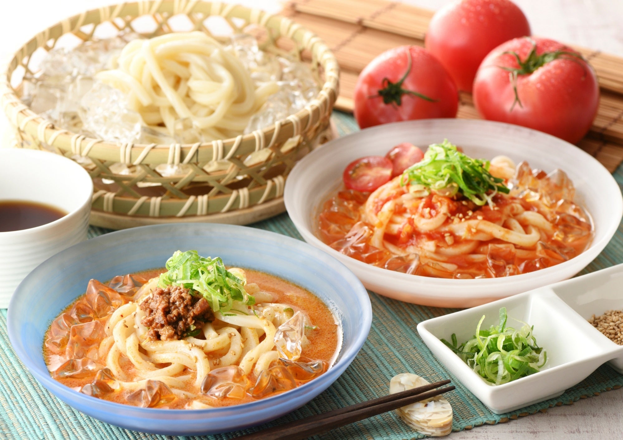 うどんコーナーでは、トマトの酸味と甘みを感じるさわやかな『トマトつゆ』と、山椒ラー油の辛味とゴマダレのコクが癖になる『麻辣胡麻つゆ』の2つの冷たい「つゆ」が登場!もちろん、うどんだけでなく、ラーメンのつけだれにしたり…色々なアレンジもお楽しみいただけます。