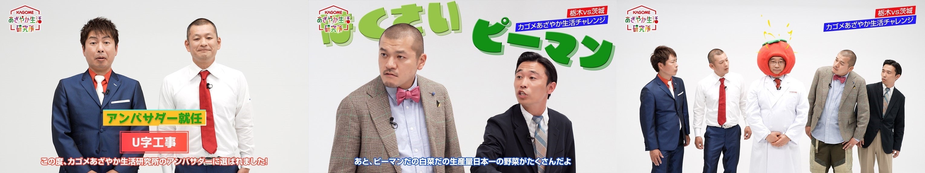 「あざやか生活研究所」は、彩り野菜のチカラで全国の皆様の生活をよりあざやかにすることを目指して2023年4月3日に開設いたしました。ココロとカラダが元気になり、今よりもさらに「あざやかな生活」を送っていただけるよう、楽しく、分かりやすく、野菜の情報をお届けしています。この度、全国に先駆け、カゴメの契約農家数No.1の茨城県(*1)、カゴメの野菜加工量No.1の栃木県(*2)とカゴメに縁のある2県の皆様からあざやかになっていただきたいという思いから、両県を代表するお笑い芸人のU字工事さんとカミナリさんをアンバサダーに起用しました。
