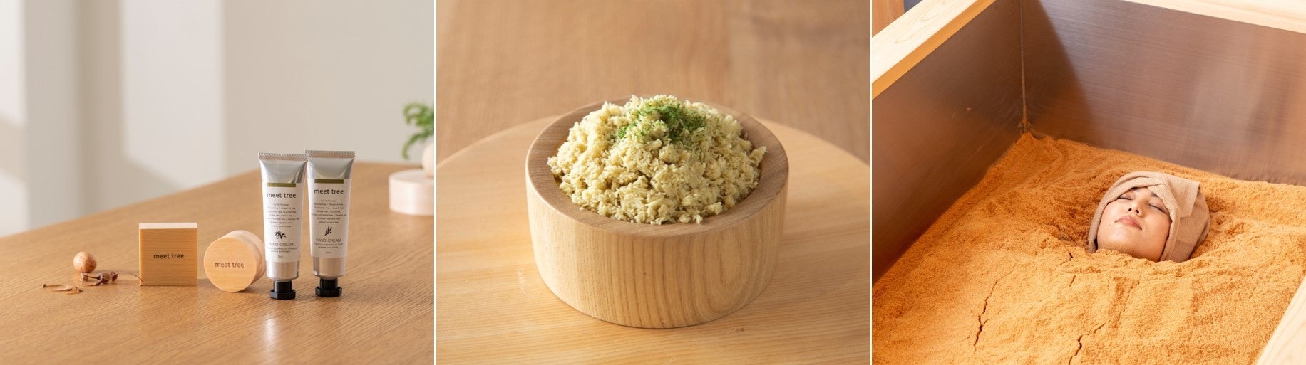 meet treeでは、「木に出会い、木を感じ、木と生きる」をコンセプトに木と人々との豊かな関係を創造するサステナブル・ライフスタイルブランドとして、コスメ「meet tree」、カフェ「meet tree Café NAKATSUGAWA」、酵素浴&サウナ施設「meet tree SPA NAKATSUGAWA」を展開しています。