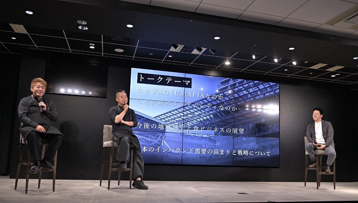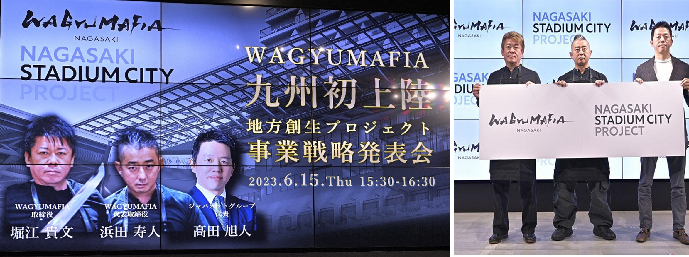 このプロジェクトの始動に際して「『WAGYUMAFIA』九州初上陸 地方創生プロジェクト事業戦略発表会」を2023年6月15日(木)に、ベクトルスタジオ(東京都港区)で実施しました。当発表会ではWAGYUMAFIA株式会社 代表取締役 浜田 寿人、取締役 堀江 貴文による事業戦略が発表され、ジャパネットグループ代表 髙田 旭人氏からは長崎スタジアムシティプロジェクトについて発表がありました。