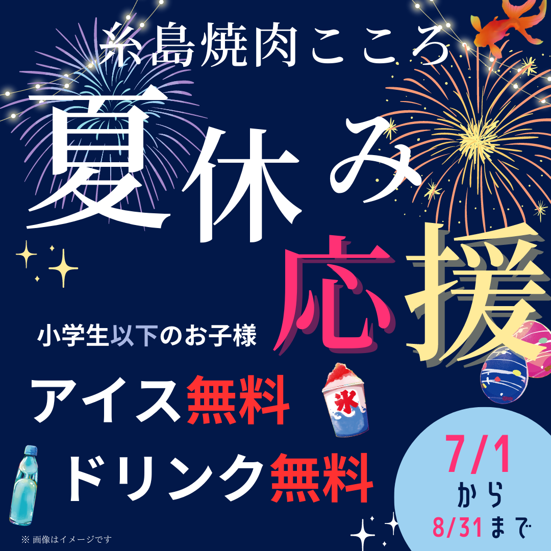 夏休み限定企画として7月1日から8月31日まで小学生以下のお子様はアイス・ソフトドリンク無料!