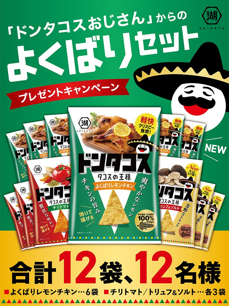 今年3月のリニューアルで、ドンタコスブランドのキャラクターである「ドンタコスおじさん」が、おしゃれな帽子を被って現代化したパッケージに復活しました。新商品「ドンタコス よくばりレモンチキン」の発売を記念し、素敵な“イケオジ”になって帰ってきた「ドンタコスおじさん」からのよくばりセットとして、現在発売中の「ドンタコス」ラインナップ全3品をプレゼントするキャンペーンを実施します。簡単応募で新商品も当たるこのキャンペーンに、ぜひご応募ください。