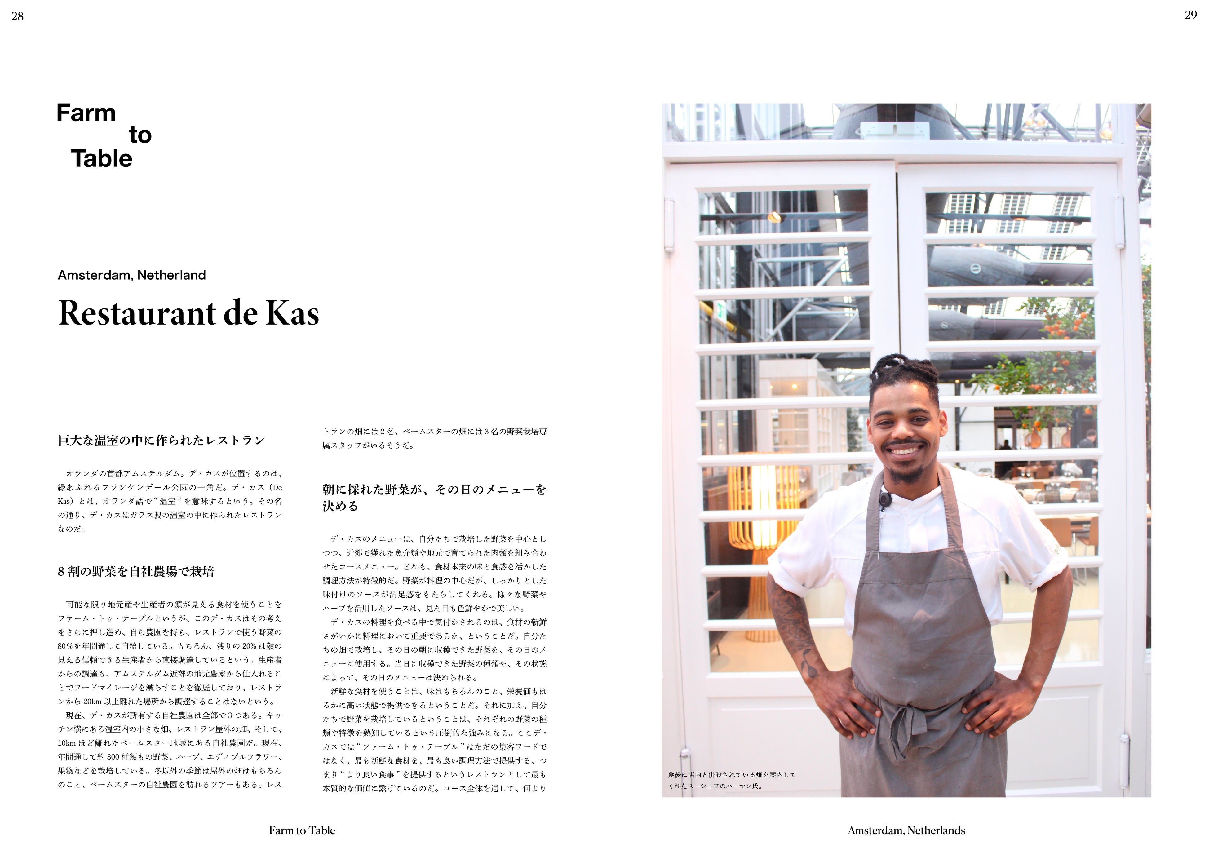 ファーム・トゥ・テーブルを実践するレストランその二、オランダの首都アムステルダムにあるデ・カス。ガラス製温室の中に作られたレストラン、自社農場で野菜を栽培すること、再エネとコンポストついて。