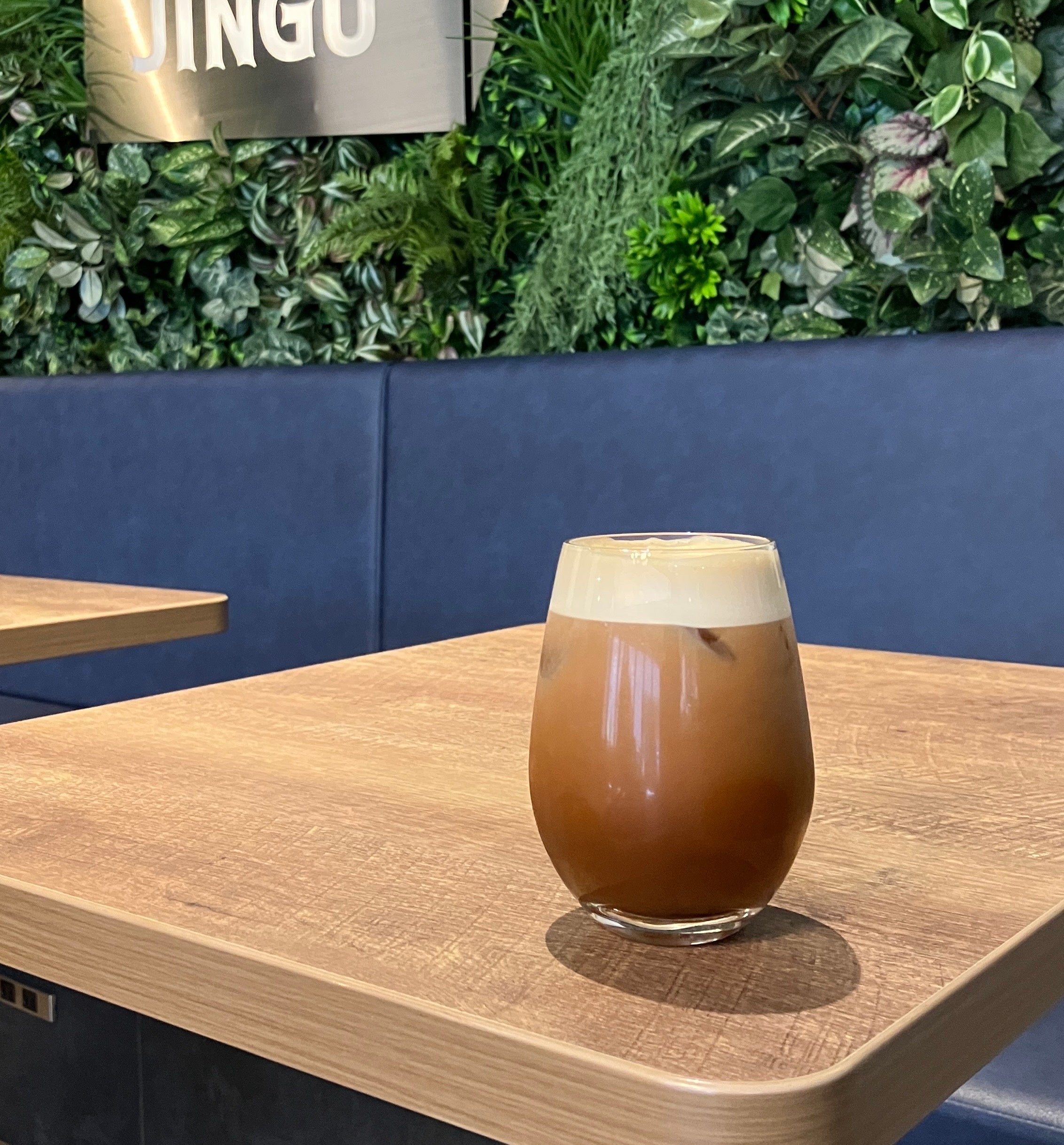 シングルオリジンのコーヒー豆で作ったアイスカフェラテに、コーヒーゼリーをいれました。