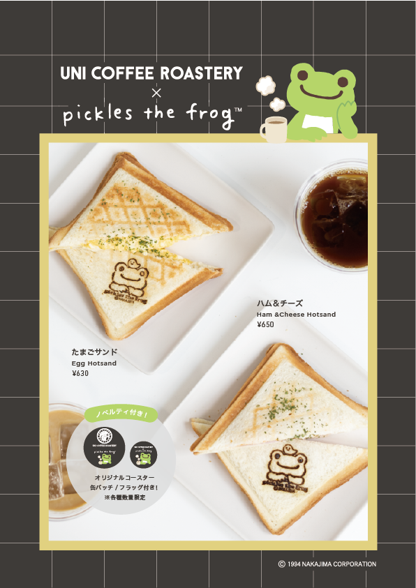 UNI COFFEE ROASTERY MARK IS みなとみらいにて、期間限定で店内の一部を”かえるのピクルス”仕様に変更する他、同店の人気メニューである「たまごホットサンド」「ハムチーズホットサンド」のかえるのピクルスコラのバージョンを販売いたします。なお、対象となるかえるのピクルスコラボバージョンの「たまごホットサンド」「ハムチーズホットサンド」をオーダーされたお客様には、かえるのピクルスとUNI COFFEE ROASTERYの特別コラボのフラッグとコースター、バッジをご提供いたします。