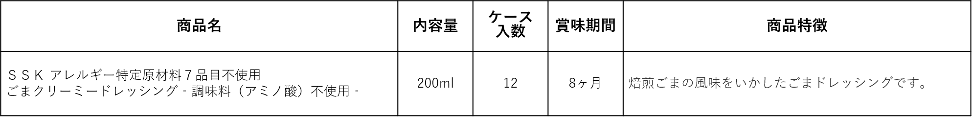 エスエスケイフーズ株式会社(本社:静岡市葵区)は、日頃ご愛顧いただいている「SSK アレルギー特定原材料7品目不使用ごまクリーミードレッシング‐調味料(アミノ酸)不使用‐」に、新たに200mlの商品を追加し、発売いたします。