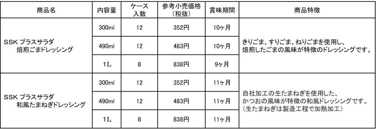 エスエスケイフーズ株式会社(本社:静岡市葵区)は、日頃ご愛顧いただいている「SSKドレッシング プラスサラダシリーズ」の「焙煎ごまドレッシング」と「和風たまねぎドレッシング」の2品をおいしくリニューアル致します。