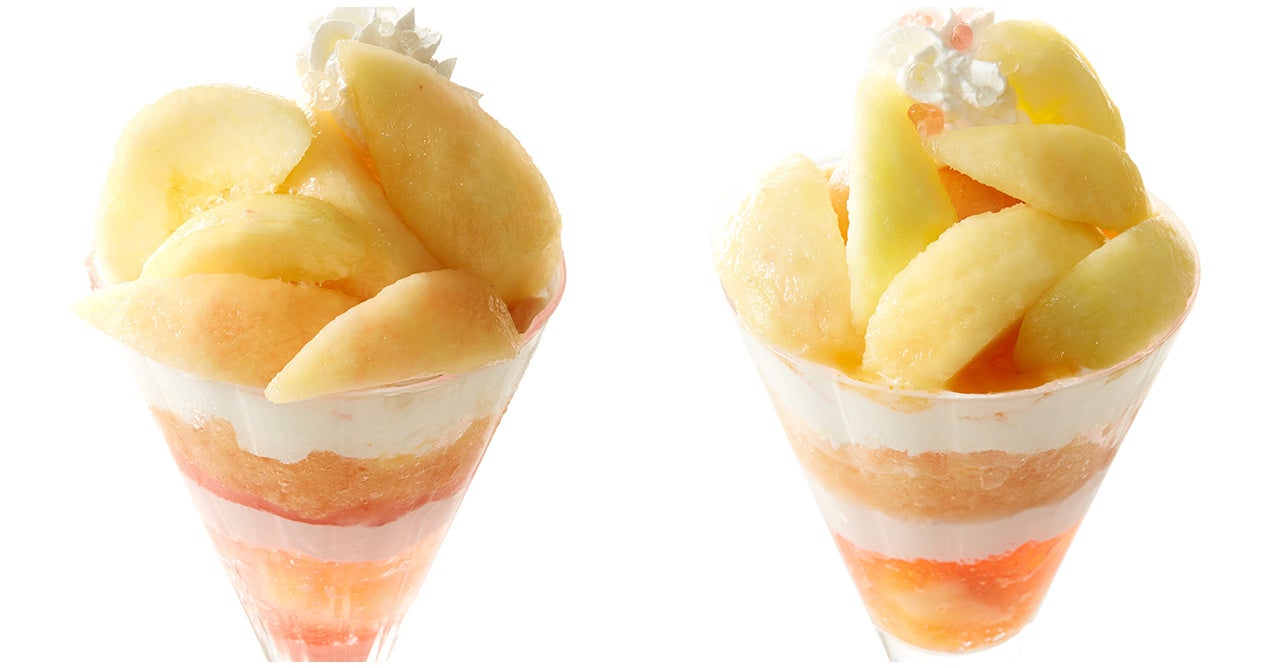 支店5店舗のパフェは、トップの桃をほおばるとみずみずしい果汁が口いっぱいに広がります。グラスに食べ進むと、オレンジピールが香りのアクセントとなるオレンジピーチソースと、桃のグラニテやクリーム、ゼリーが重なります。桃のやさしい印象の中にもオレンジのさわやかさが残る夏らしい一品です。