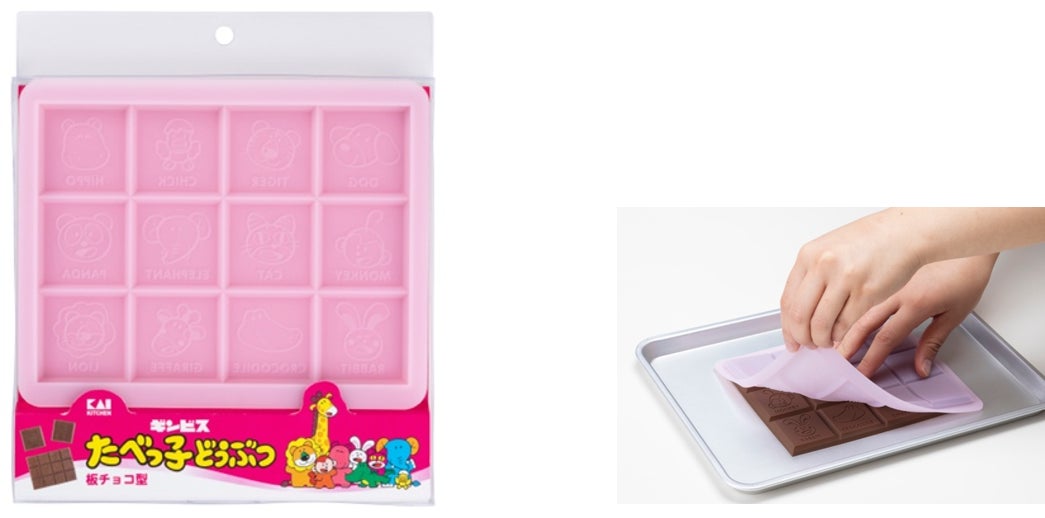 たべっ子どうぶつの12種類の絵柄が入った板チョコレートを作れるシリコーン型です。1枚でそのまま渡すことも、割って渡すこともでき、プレゼントにもぴったりです。