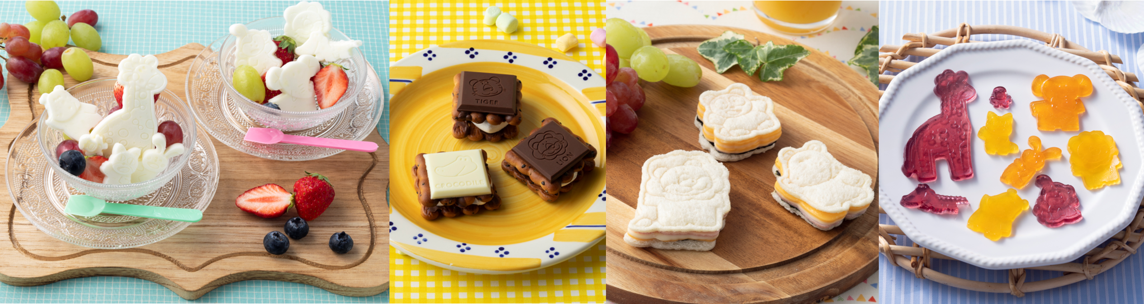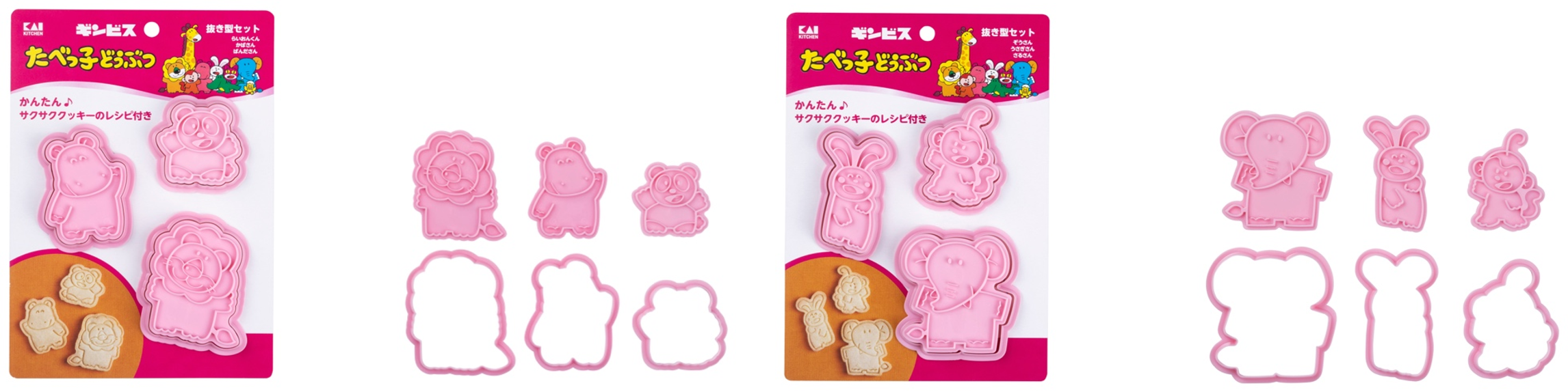 たべっ子どうぶつのキャラクターのクッキーを作れる、抜き型とスタンプ型のセットです。細かい表情をスタンプで簡単に表現することができます。らいおんくん・かばさん・ぱんださん、ぞうさん・うさぎさん・さるさんの2つの組み合わせで展開。