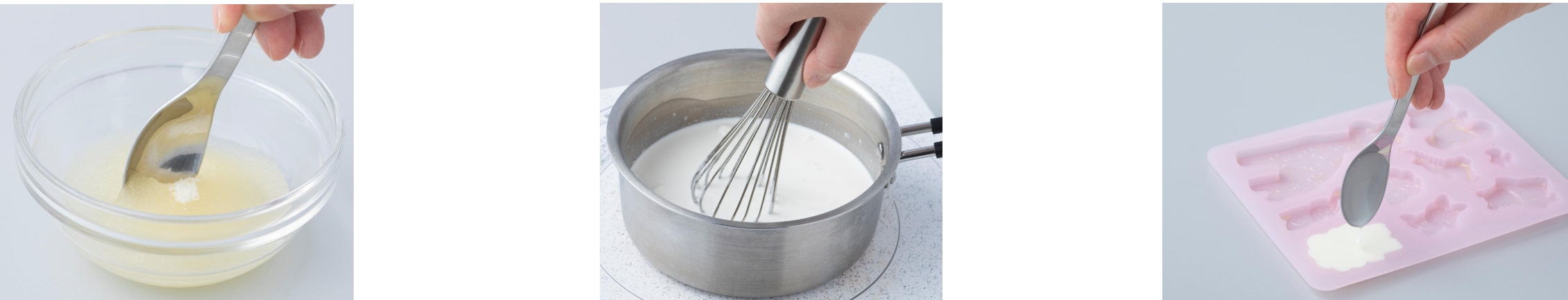 ②トレーの上にシリコーン型を乗せ、静かに流し込み、冷蔵庫で冷やす。(1時間程度)