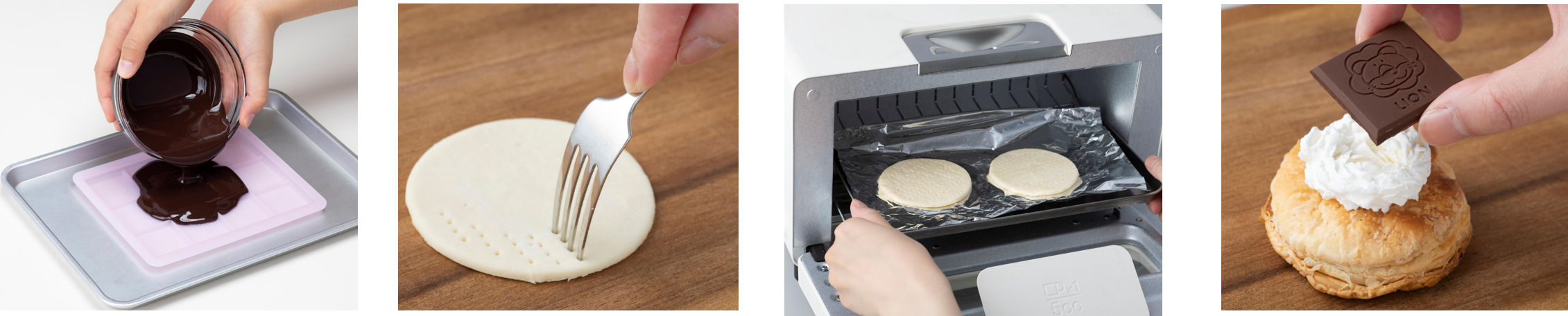 パイシートをトースターで焼き、生クリームを絞ってチョコを乗せたアレンジです。パイシートは冷凍のものを、チョコはテンパリング不要のものを使用しているため、失敗なく簡単に作ることができます。