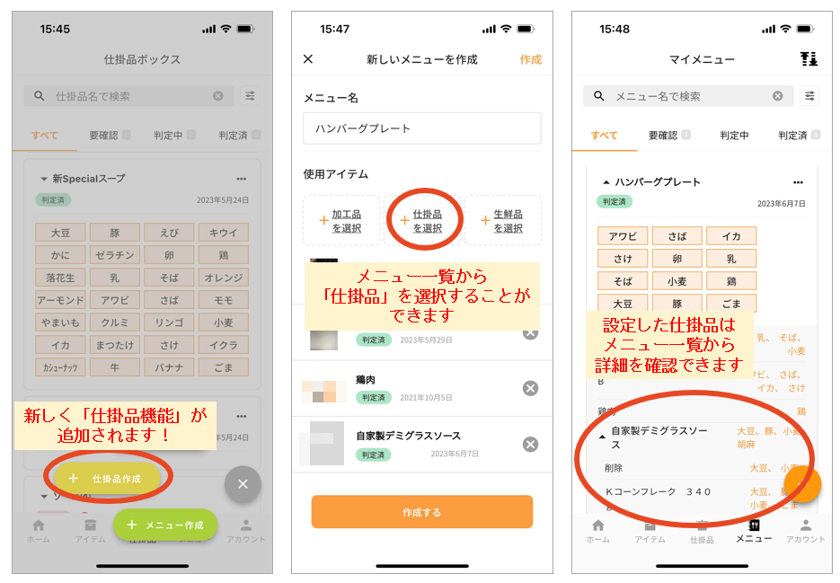 ■あらかじめ仕込んだソースなどの仕掛品も登録可能に!アレルギー管理サービスがバージョンアップ