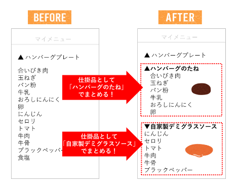 たとえば、ハンバーグのタネ、添え野菜、自家製ソース、自家製ドレッシングで構成される『ハンバーグプレート』というメニューを登録するとします。これまではアレルゲンの管理をする上で、タネやソースなどの区別なくすべての原材料を一つひとつ登録する必要があり、「自家製ソースをかけなければ提供可能な食材なのか」といった仕掛品を考慮した判断がしにくい状態となっていました。