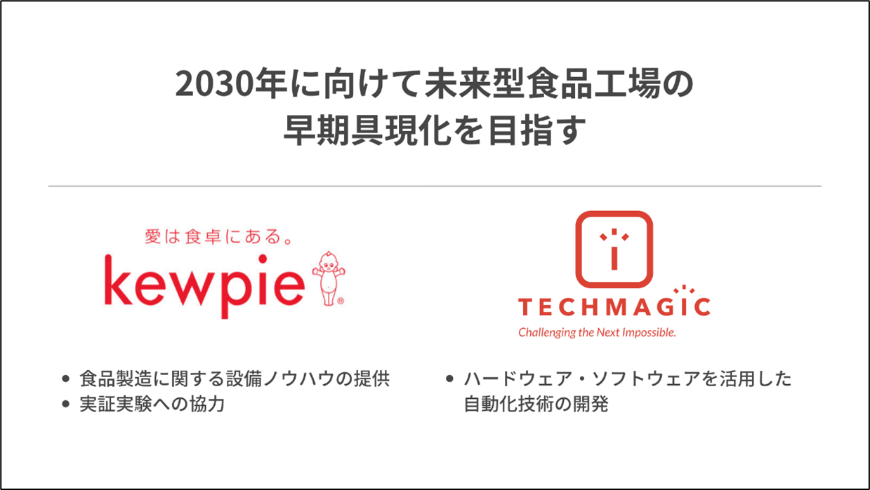 キユーピーとTechMagicは、この度の資本業務提携により、食品製造における業務自動化技術の開発に取り組み、食品工場全体における生産性の向上と人手不足への対応を両社で推進していきます。