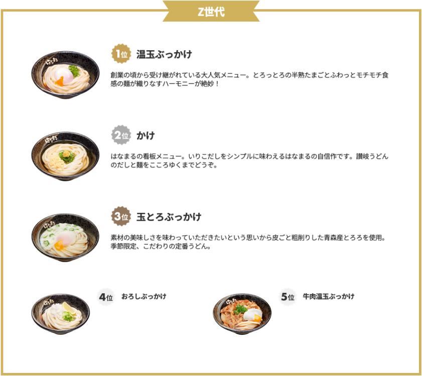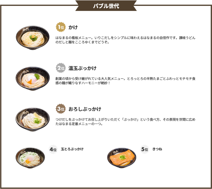 Z世代、バブル世代ともに1位から4位までに「温玉ぶっかけ」「かけ」「玉とろぶっかけ」「おろしぶっかけ」がそれぞれランクインしており、「はなまるうどん」の定番メニューは世代を超えて愛されるメニューということが分かりました。
