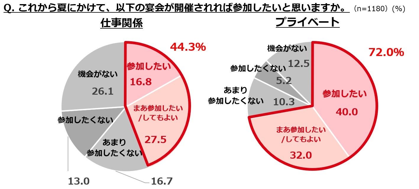 ぐるなびが全国のユーザーを対象に実施した調査によると、5月8日の新型コロナウイルスの5類移行後に「外食が増えた」と約3割が回答。さらに夏にかけて開催される宴会については、特にプライベート宴会で約7割と高い参加意向がうかがえました。このような外食意向の高まりを背景に、本キャンペーンを開催することで夏の宴会の開催を促し、飲食店への送客を拡大させ外食産業のさらなる活性化に貢献していきます。
