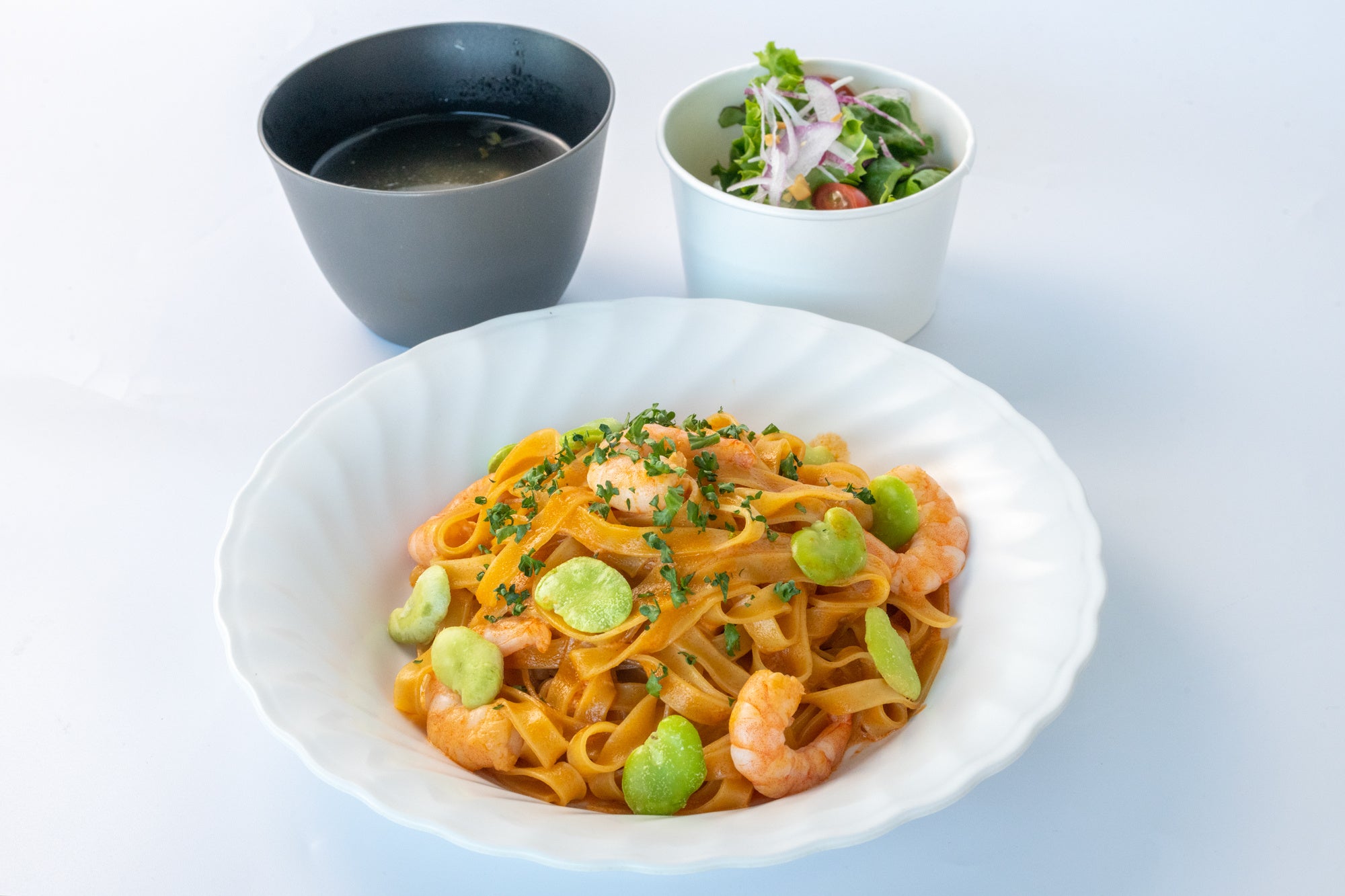 バナメイエビと旬のそら豆を使用したトマトクリームのフェットチーネです。