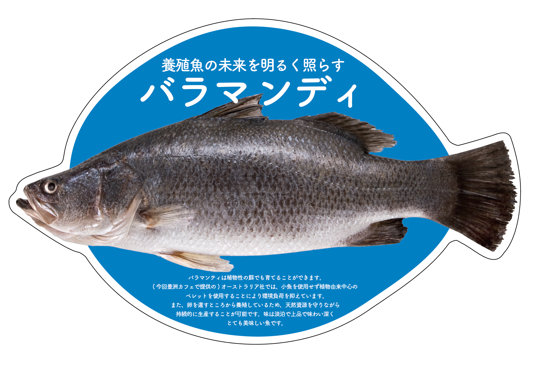 バラマンディ:スズキ目アカメ科に属している魚の一種で、植物性の餌でも育てることができます。今回豊洲カフェで提供したオーストラリアの養殖企業では、小魚を使用せず植物由来中心のペレットを使用することにより環境負荷を抑えています。