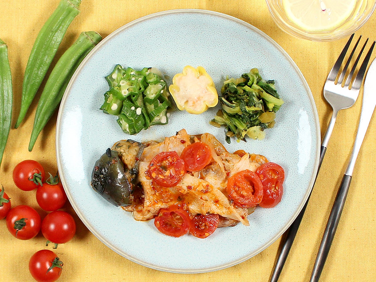 薄くスライスした豚バラ肉に、ニンニクをきかせたラー油ソースをかけました。添え野菜には、もやし、わかめであえた揚げ茄子、トマトを使用しております。トマトの爽やかな酸味とラー油ソースの相性はばっちりです。よく混ぜてお召し上がりください。