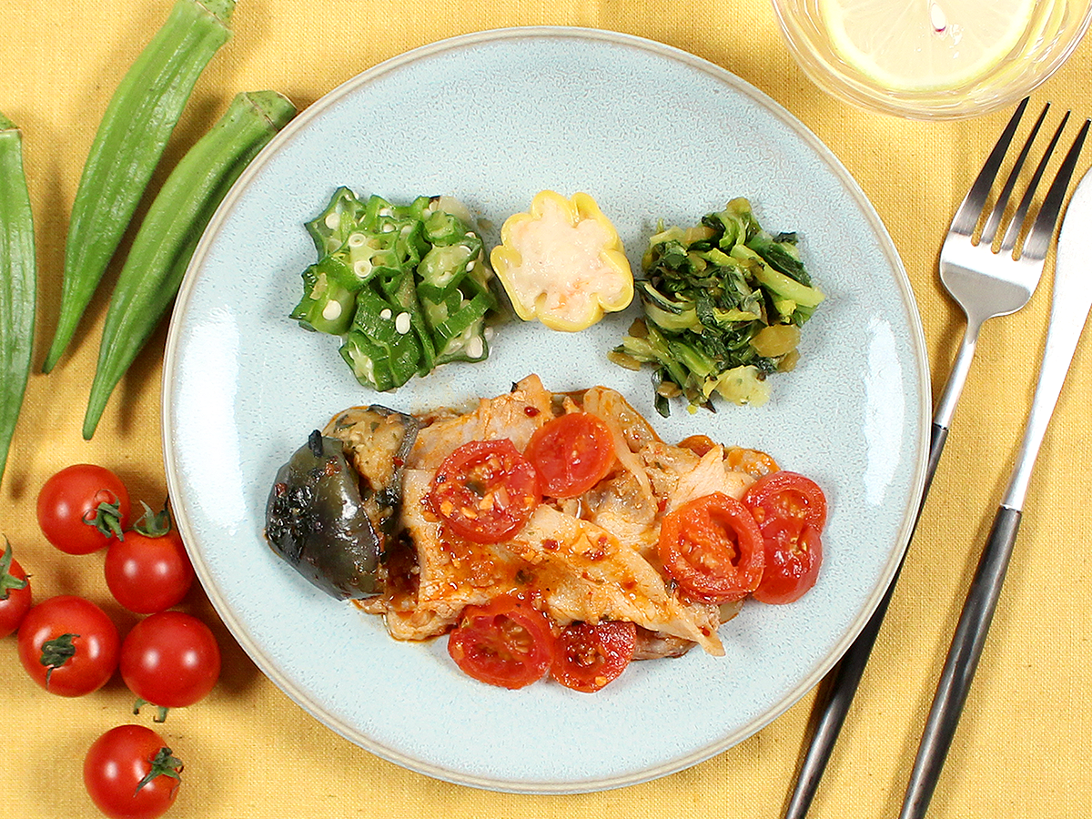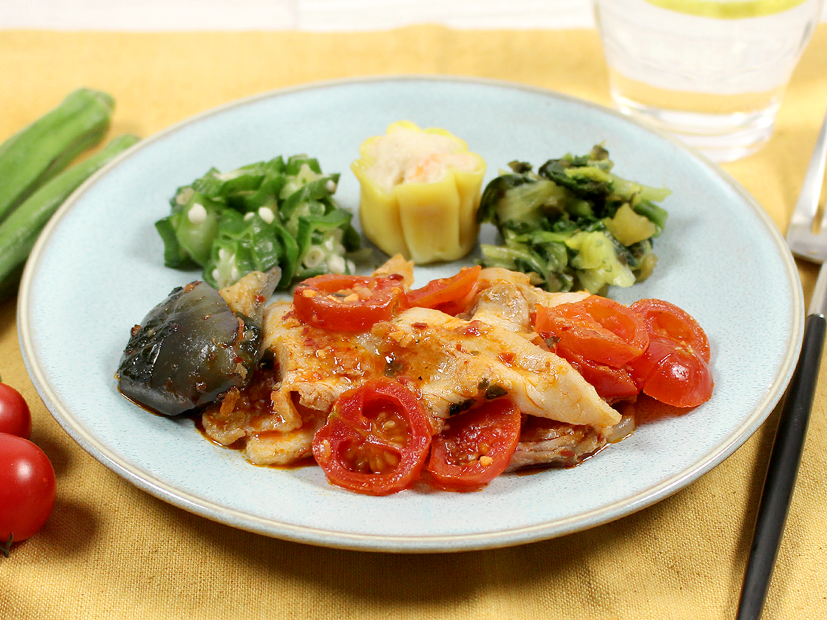薄くスライスした豚バラ肉に、ニンニクをきかせたラー油ソースをかけました。添え野菜には、もやし、わかめであえた揚げ茄子、トマトを使用しております。トマトの爽やかな酸味とラー油ソースの相性はばっちりです。よく混ぜてお召し上がりください。