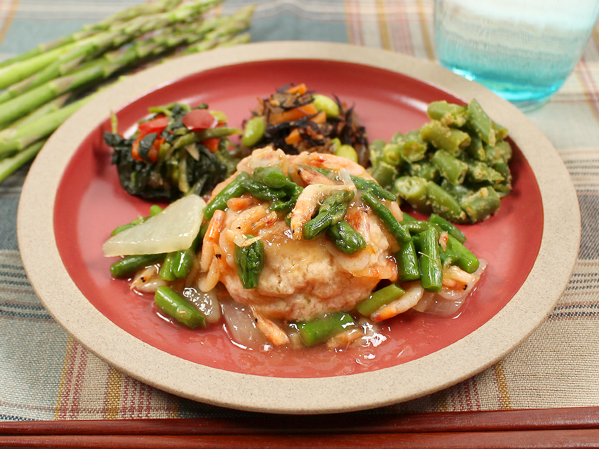 野菜と魚のすり身に桜海老を加えた豆腐寄せを和風だしで仕上げました。釜揚げ桜海老を贅沢に使用しております。薄くスライスしたかぶ、刻んだアスパラと合わせてお召し上がりください。ふわふわとした食感の豆腐寄せに優しい和風だしと桜海老の香りをお楽しみいただけます。