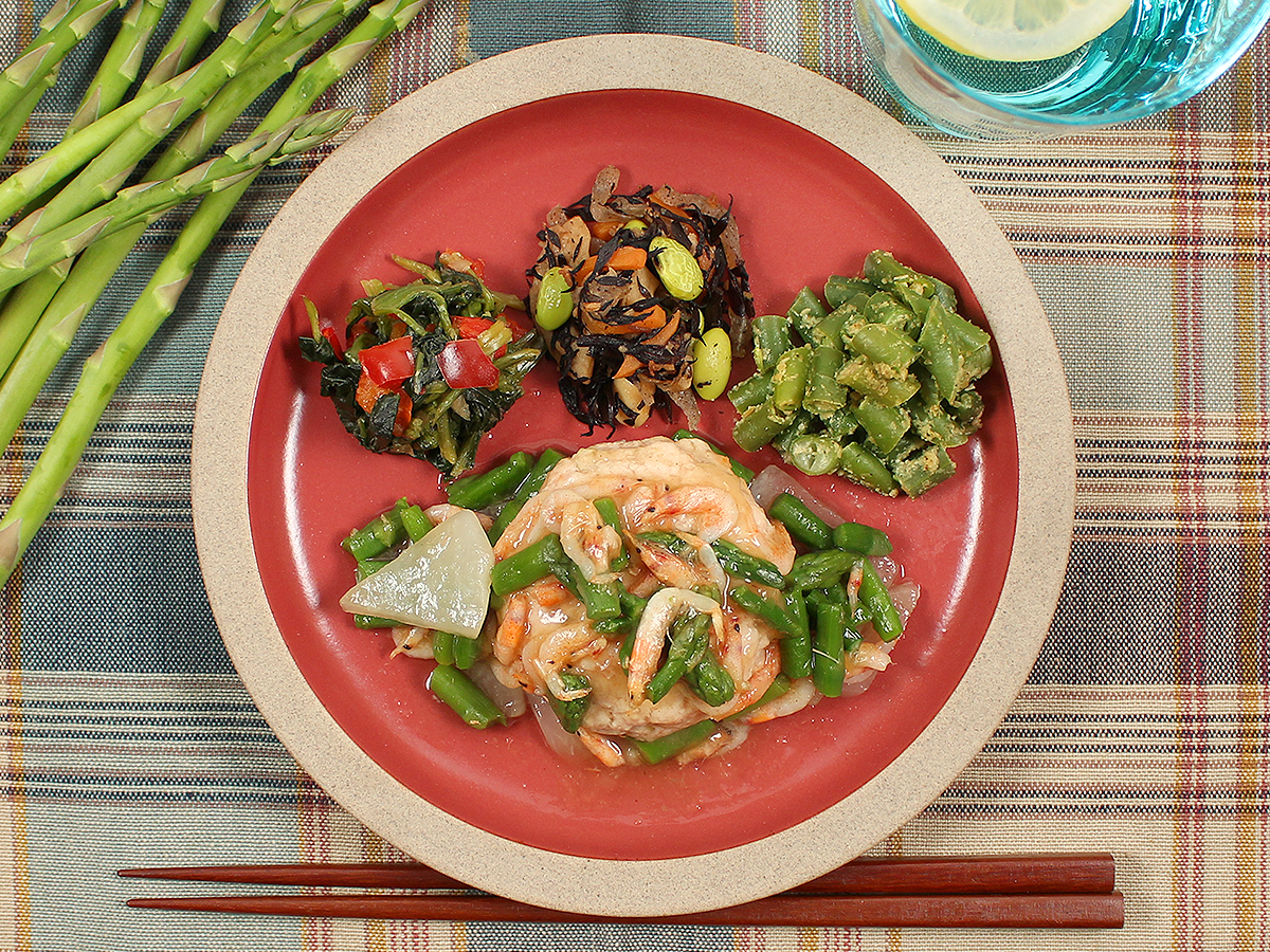 副菜は、赤ピーマン入りほうれん草のあえもの、そぼろを混ぜたえだまめひじき、すり胡麻を加えたいんげんのごまあえです。
