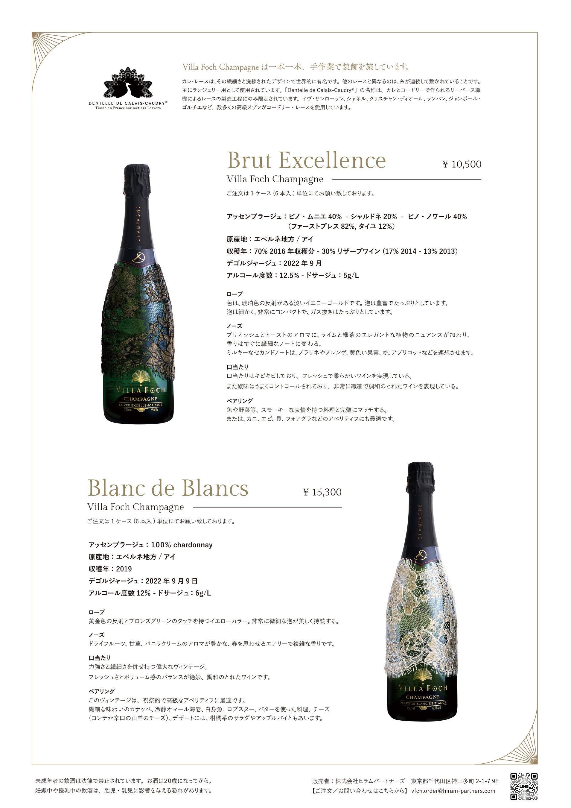 最高品質のセパージュを使い、繊細な泡と味にこだわりぬいたのは勿論、フランスの職人が手作業で織る貴重なレースでボトル一本々を飾りました。皆様の期待にそえる商品だと自負しております。