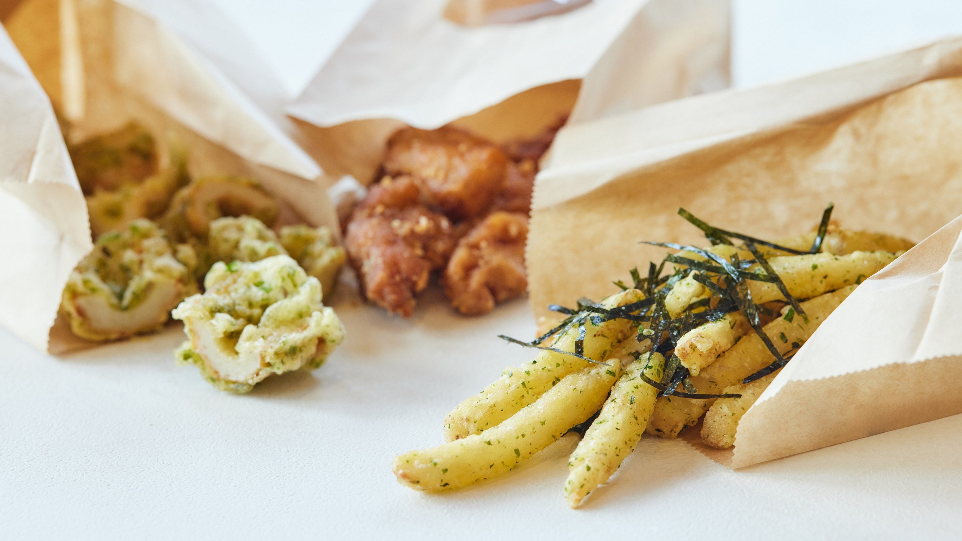 店内で仕込み、ひとつ一つ丁寧に揚げる天ぷらの人気メニュー『ちくわ磯辺天』と、鶏もも肉のジューシーなから揚げがひと口サイズになって登場します。